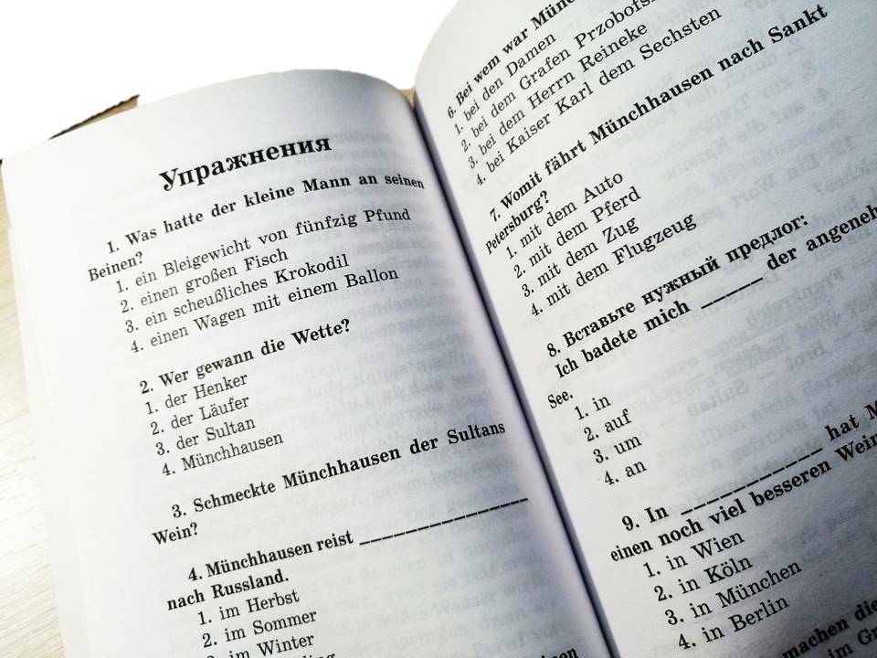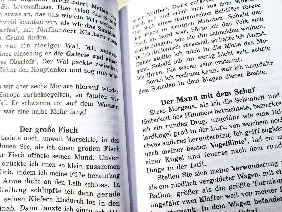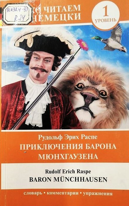 Распе Р. Э. Приключения барона Мюнхгаузена [= Raspe R. E. Baron Münchhausen] / Рудольф Эрих Распе – на немецком языке. – Москва : АСТ, 2021. – 128 с. Книга из серии «Легко читаем по-немецки» для уровня Elementary. Тексты рассказов незначительно сокращены и снабжены комментариями. Адаптированный текст дополнен словарем. Предлагаются упражнения с ключами. Адаптация С. А. Матвеева.