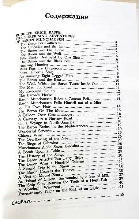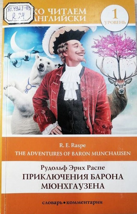 Распе Р. Э. Приключения барона Мюнхгаузена [= Raspe R. E. The Adventures of Baron Munchausen] / Рудольф Эрих Распе – на английском языке. – Москва : АСТ, 2021. – 96 с. Книга из серии «Легко читаем по-английски» для уровня Elementary. Адаптированный текст дополнен словарем. Адаптация С. А. Матвеева.