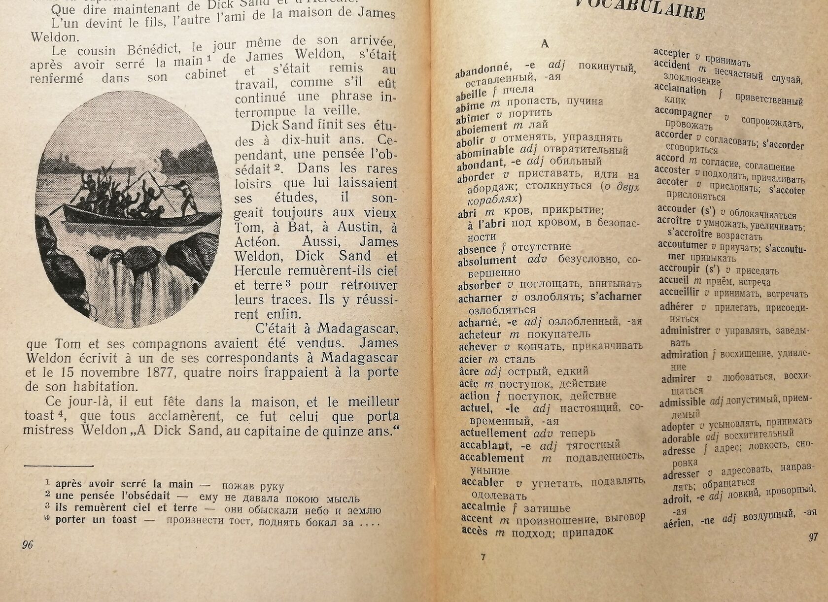 Верн Ж. Пятнадцатилетний капитан [=Vern J. Un Capitaine de Quinze Ans] / Жюль Верн – на французском языке – Москва, Издательство Министерства Просвещения РСФСР, 1952, 128 с. Издание для внеклассного чтения на французском языке для школьного возраста. Текст облегчен и сокращен, трудные места поясняются в постраничных комментариях, дан словарь.