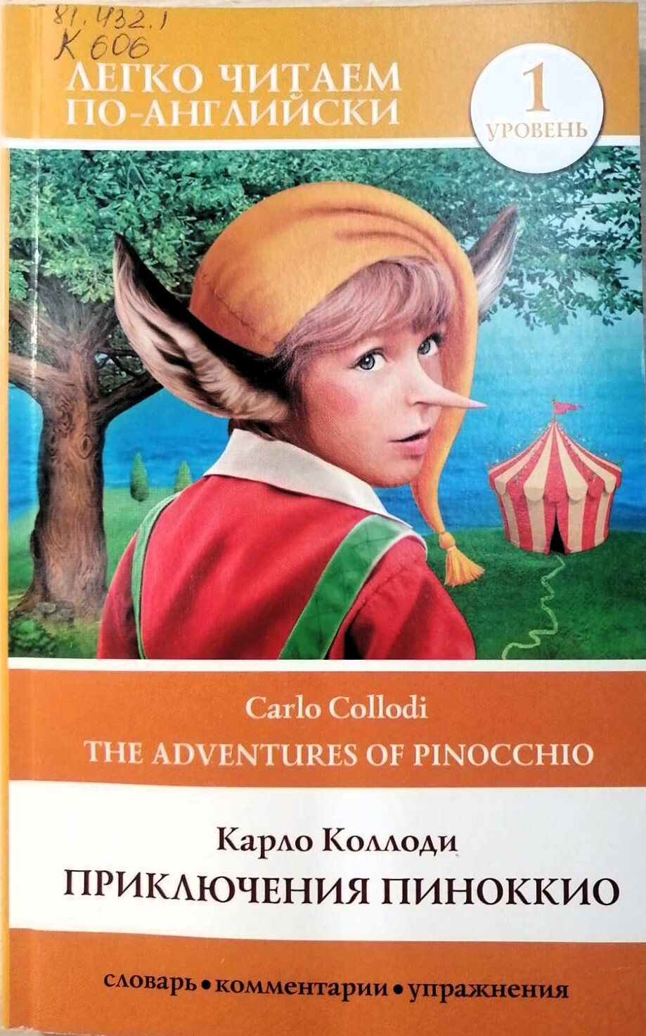 Коллоди К. Приключения Пиноккио [= Collodi C. The Adventures of Pinocchio] / Карло Коллоди. – на английском языке. – Москва : АСТ, 2021. – 128 с. Книга из серии «Легко читаем по-английски» для уровня Elementary. Адаптированный текст снабжен комментариями. Книга дополнена упражнениями и словарем. Адаптация С. А. Матвеева.